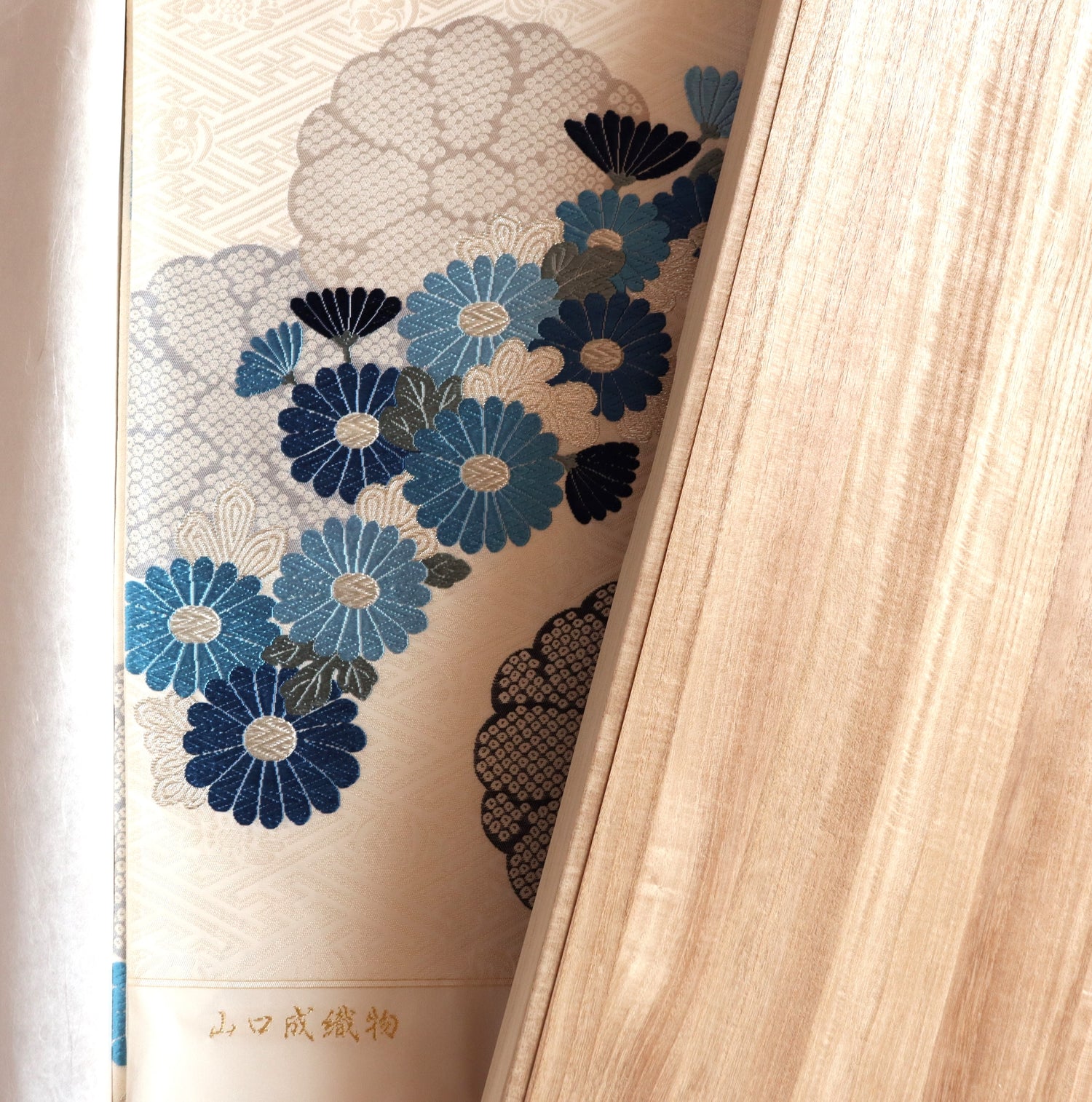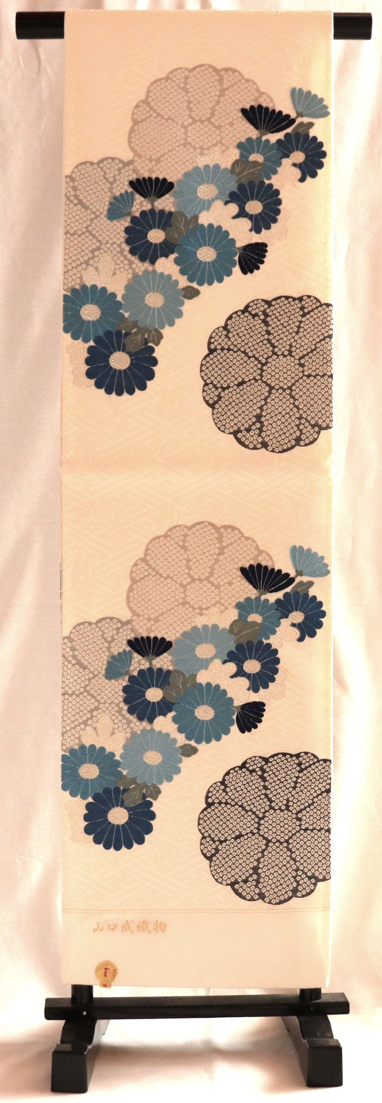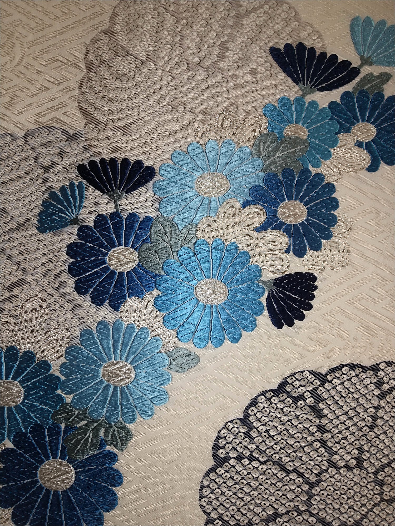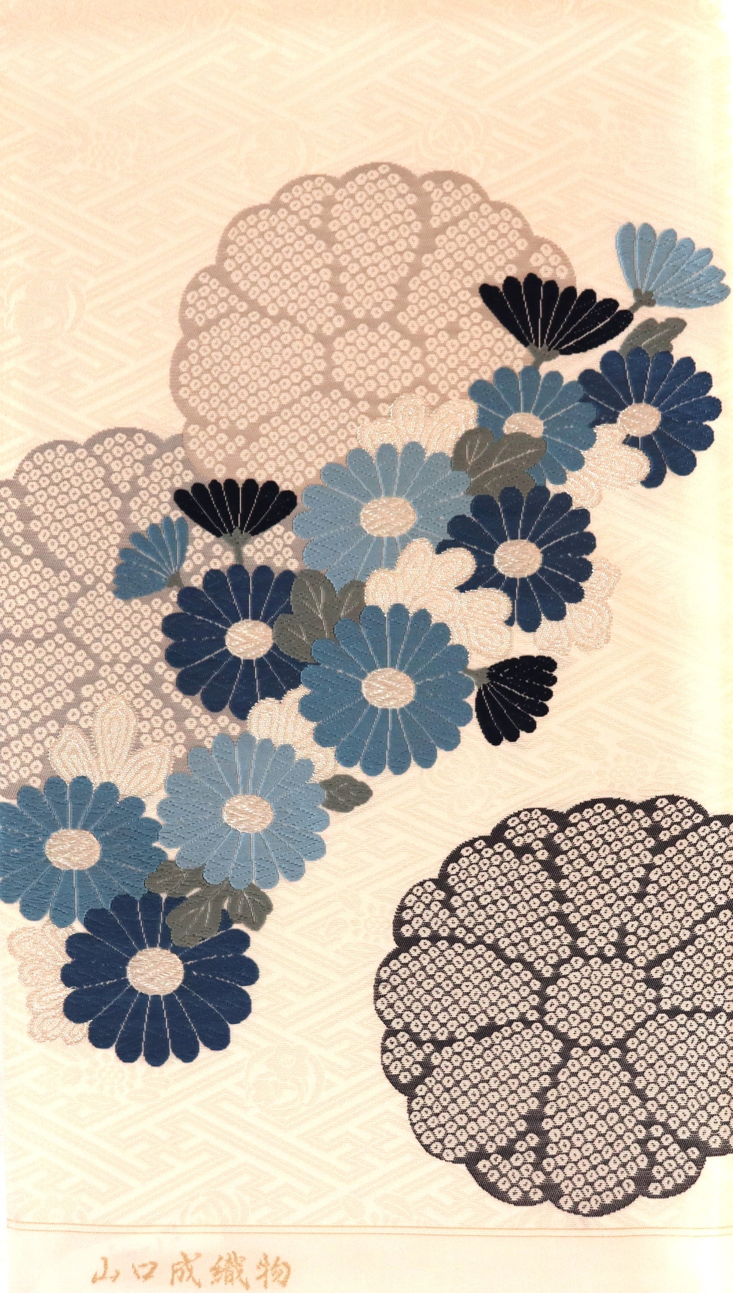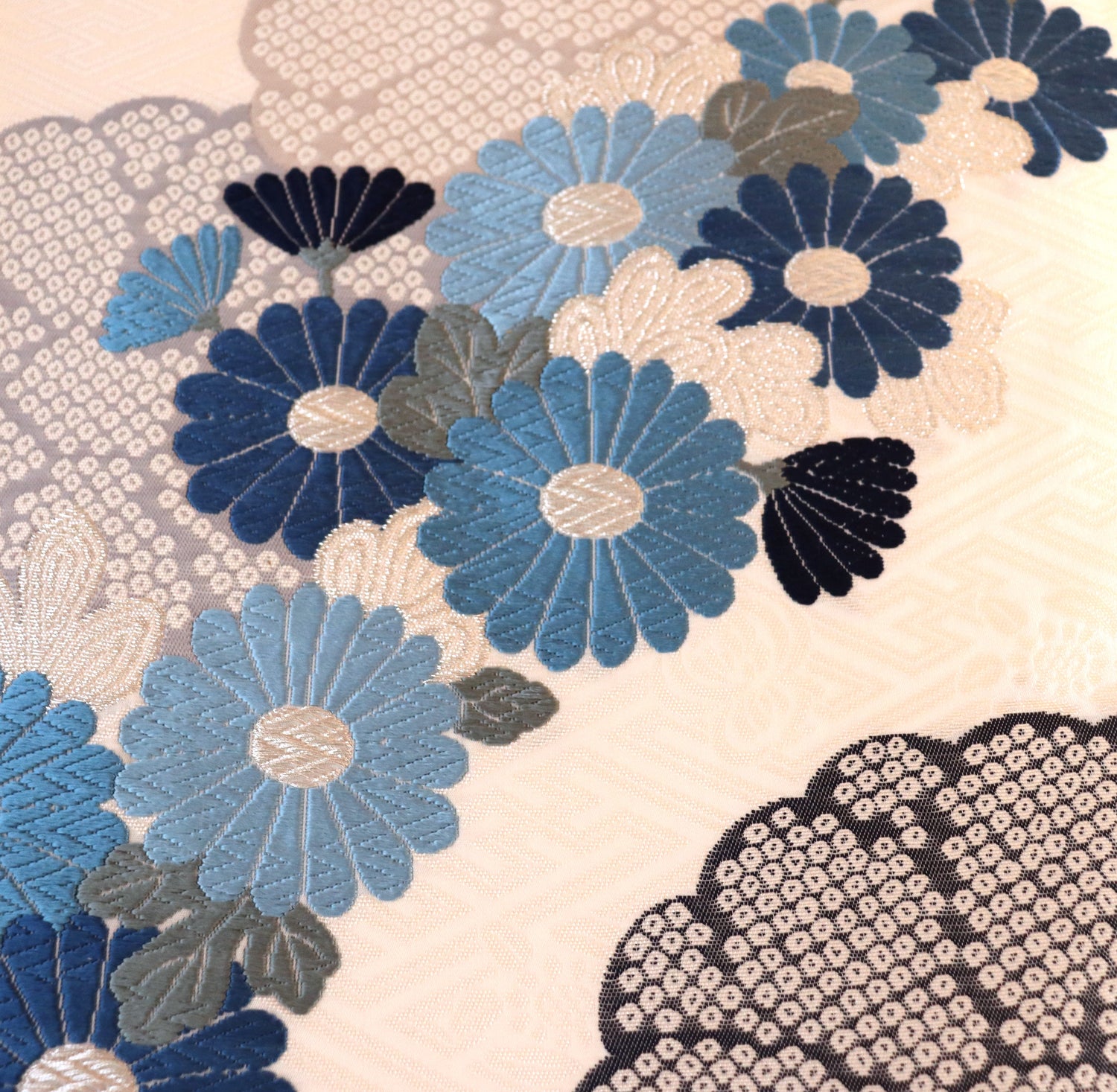 紗綾型の地紋に纐纈(「鹿の子絞り」や「疋田絞り」のこと)をイメージした紋様とブルーを基調とした色糸で菊花文が織り出された華やかな逸品です。