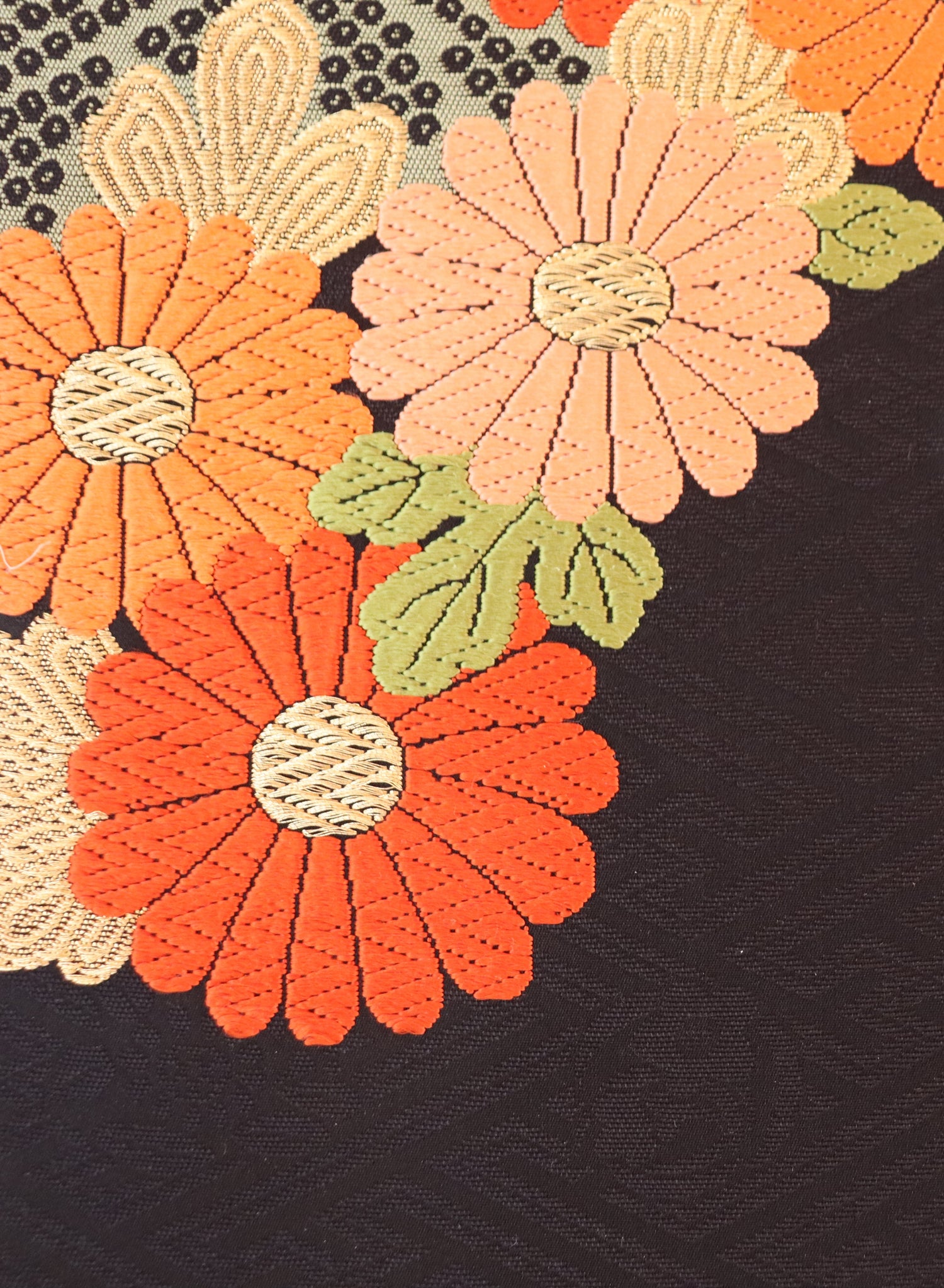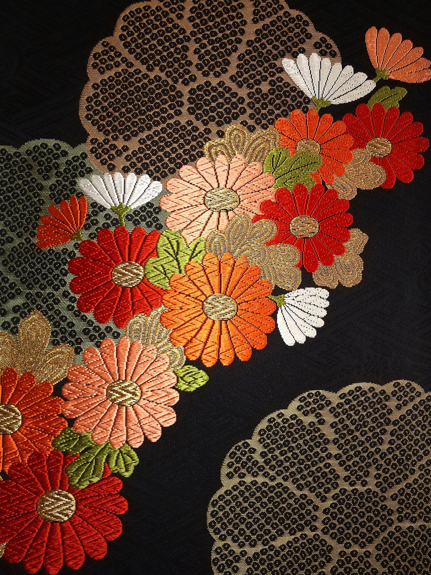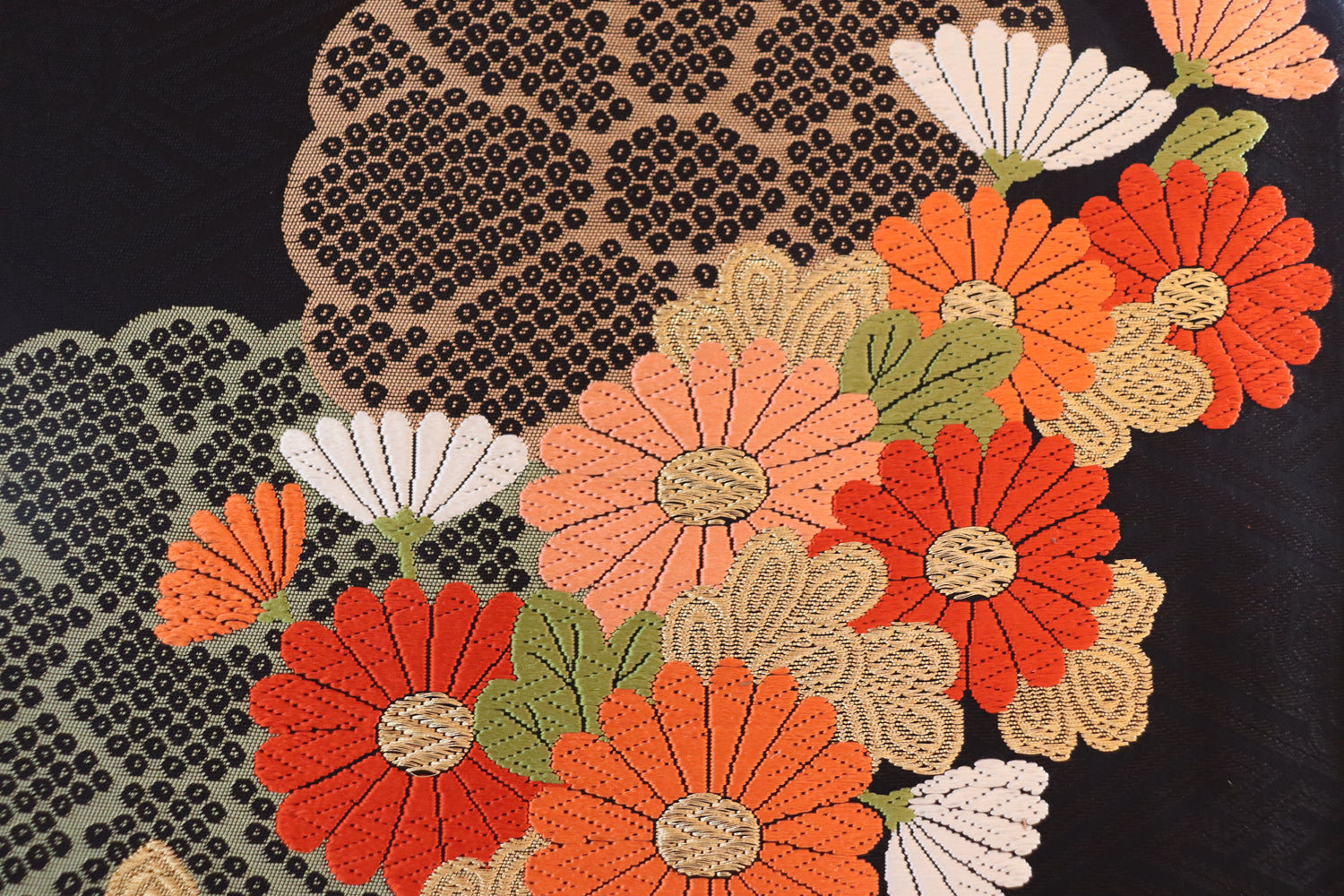 紗綾型の地紋に纐纈(「鹿の子絞り」や「疋田絞り」のこと)をイメージした紋様と黒地に明るい色糸で菊花文が織り出された華やかな逸品です。