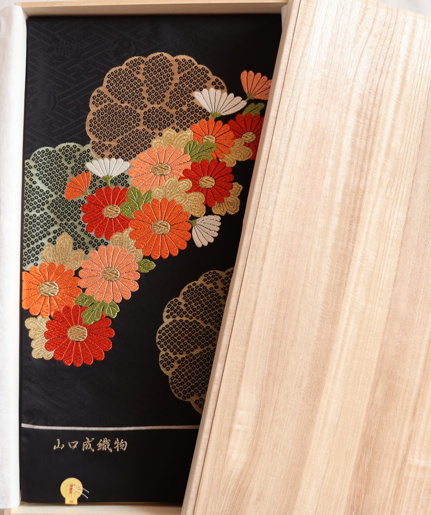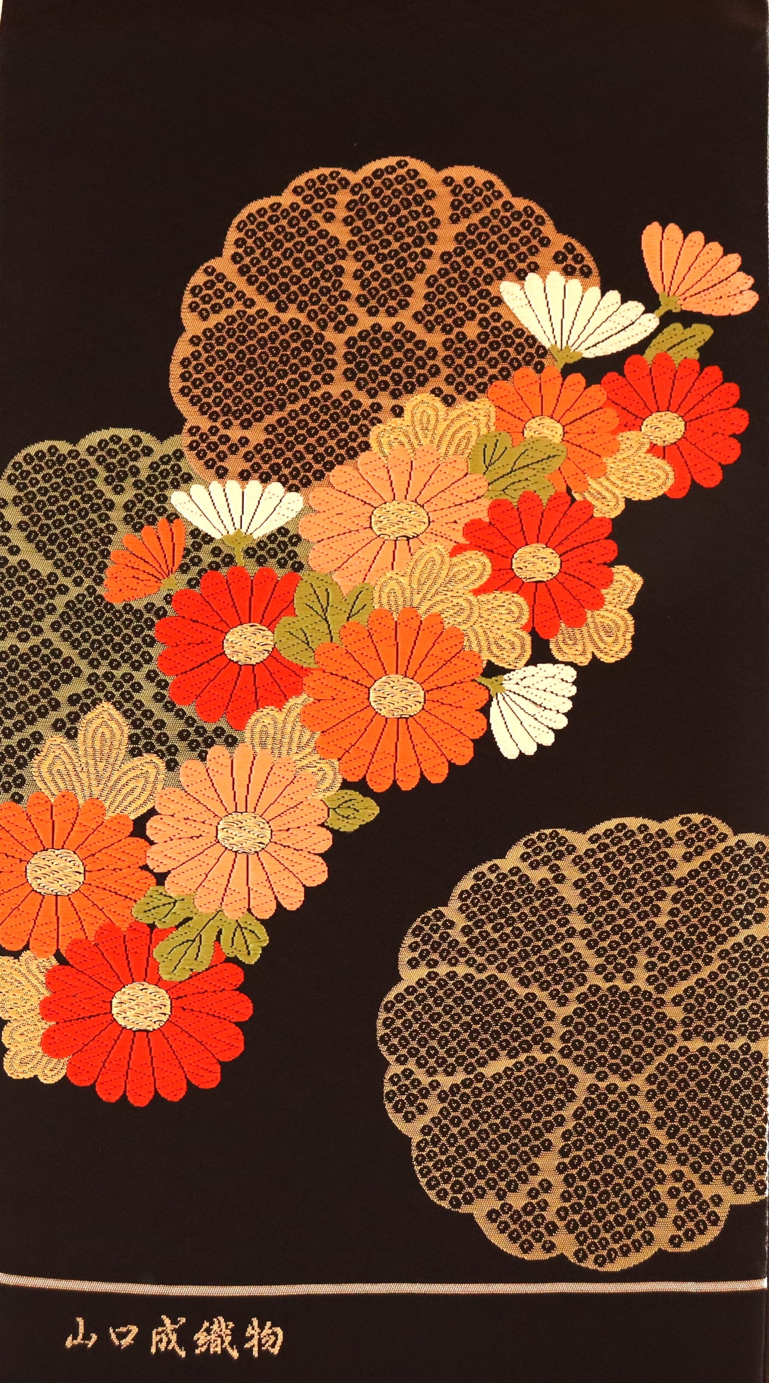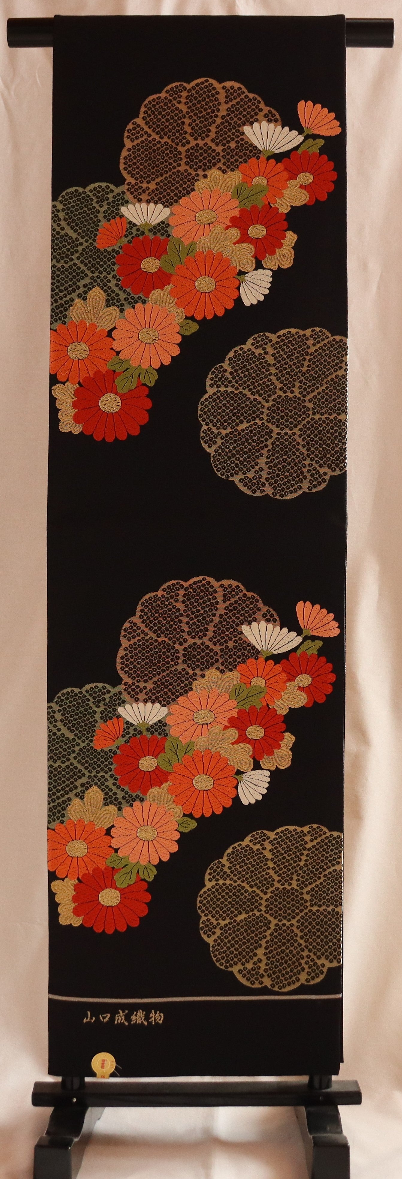 紗綾型の地紋に纐纈(「鹿の子絞り」や「疋田絞り」のこと)をイメージした紋様と黒地に明るい色糸で菊花文が織り出された華やかな逸品です。